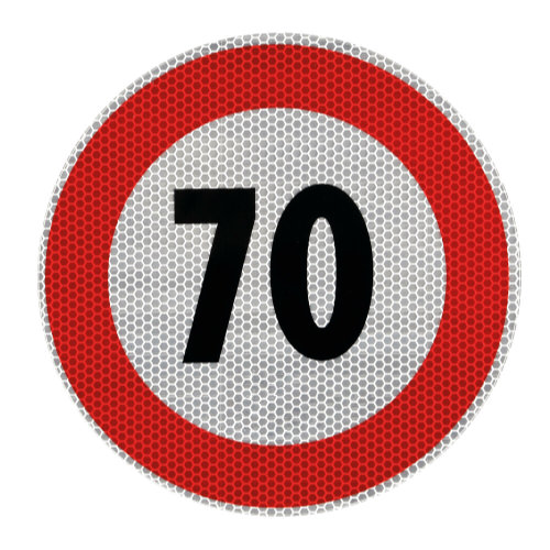 Contrassegno limite velocità - 70 Km/h. Adesivo retroriflettente omologato classe 2, conforme alle normative europee, garantisce massima visibilità e sicurezza.