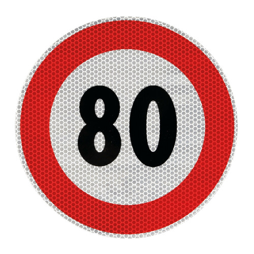 Contrassegno limite velocità - 80 Km/h. Adesivo retroriflettente omologato classe 2, conforme alle normative europee, garantisce massima visibilità e sicurezza.