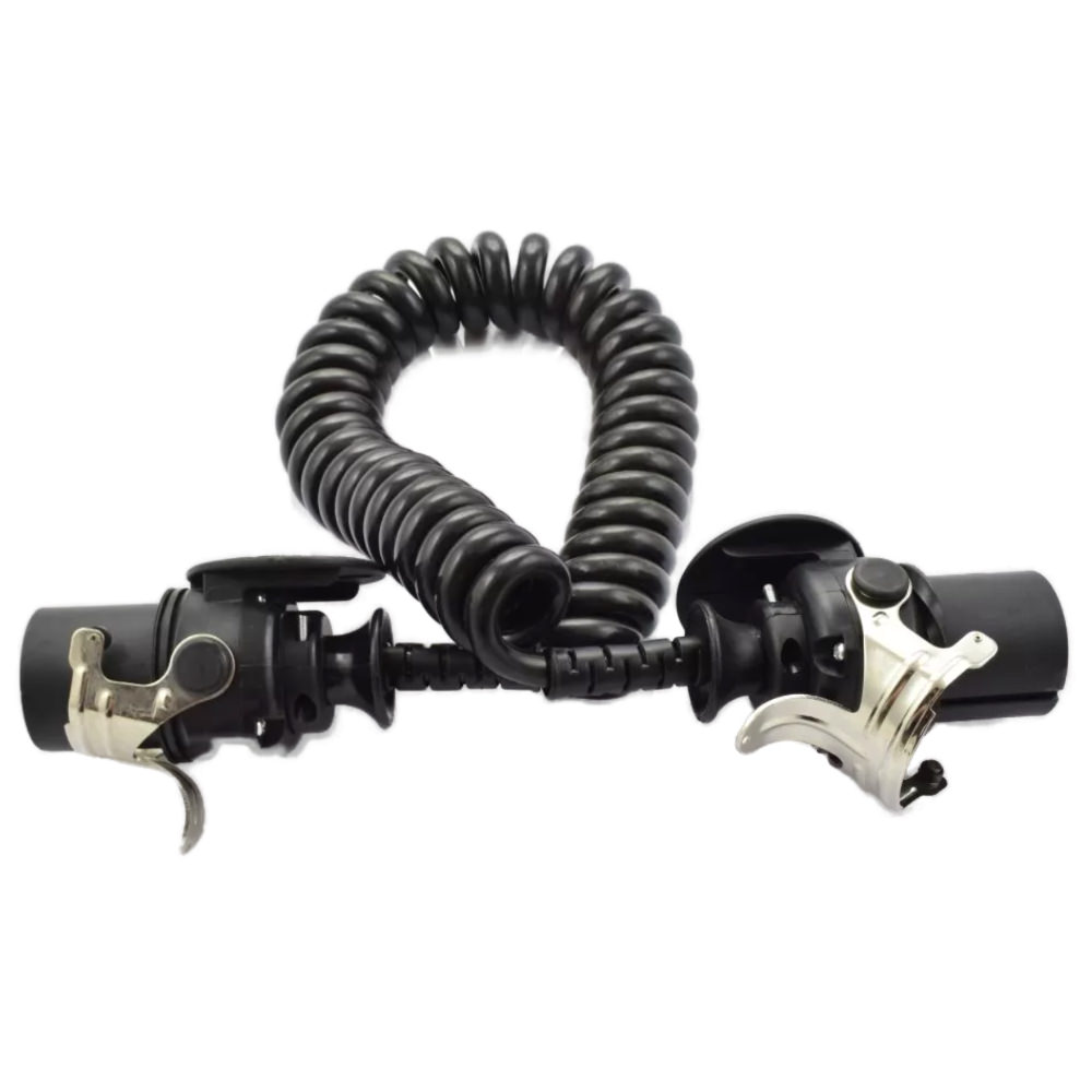 Spirale elettrica di alta qualità per sistemi EBS (Electronic Braking System). Cavo a 7 poli, 24V, con lunghezza di lavoro estensibile fino a 3,8 metri. Essenziale per una connessione sicura e affidabile tra motrice e rimorchio, garantendo il corretto funzionamento del sistema di frenata elettronica.